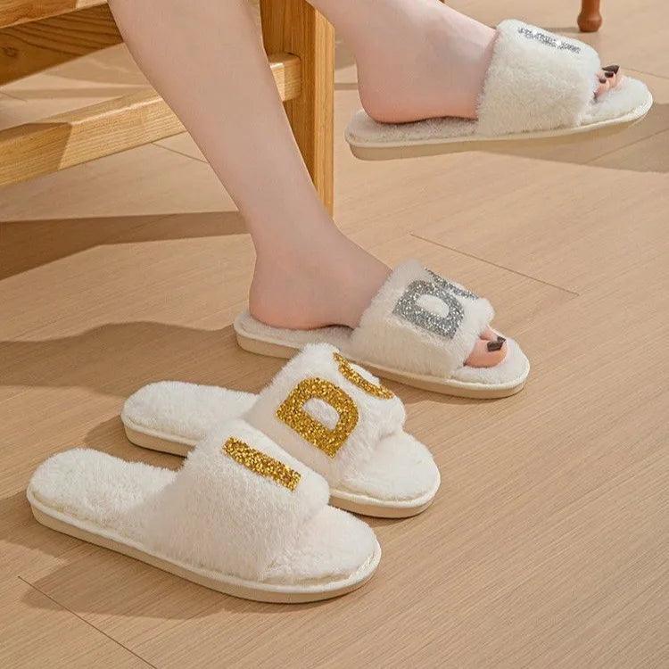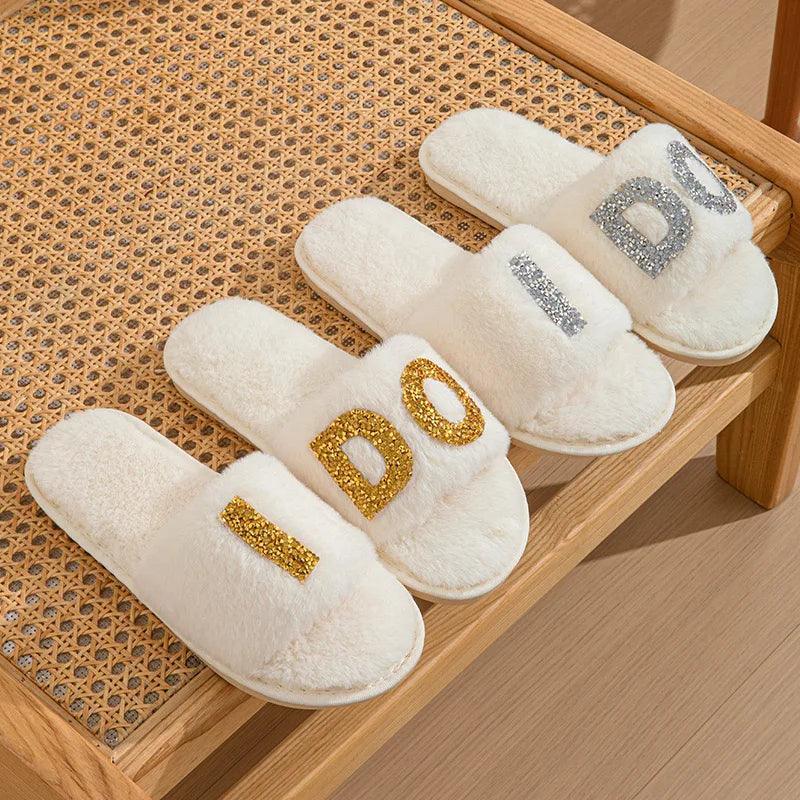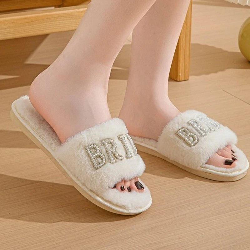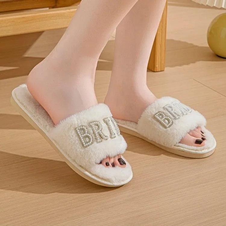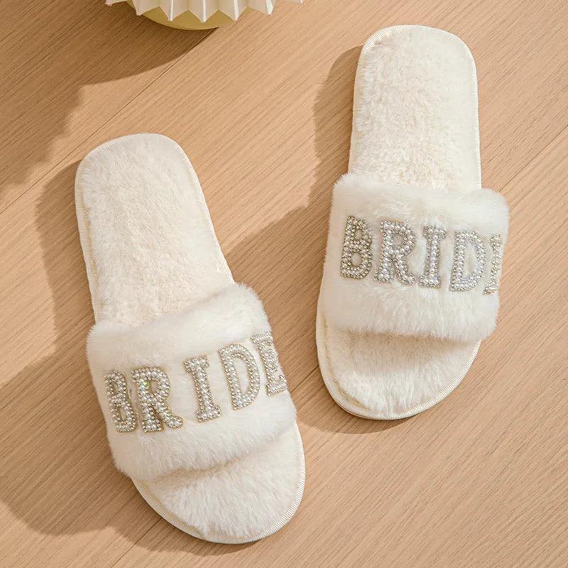 Step into elegance with the Bride Bedazzled Slippers, the perfect footwear for any bride. These stunning slippers feature intricate pearl and rhinestone detailing that adds a touch of sparkle to your wedding day or honeymoon. The fluffy, soft slides offer comfort and style, making them ideal for wearing during pre-wedding preparations, at the bridal shower, or even as a thoughtful proposal gift. The luxurious design and plush feel make these slippers an unforgettable accessory for any bride-to-be.