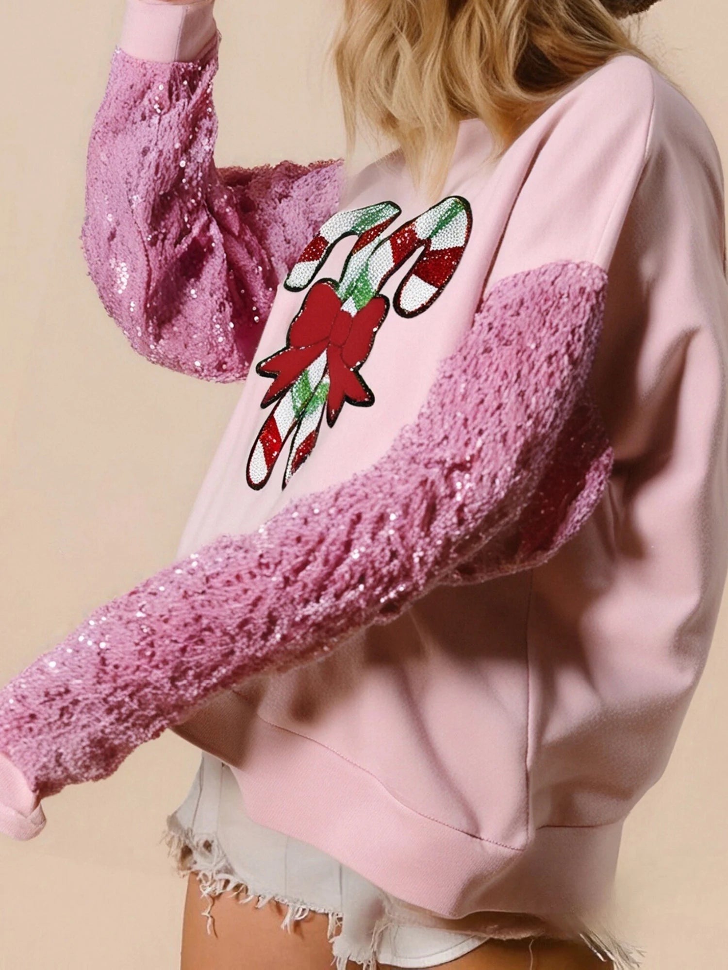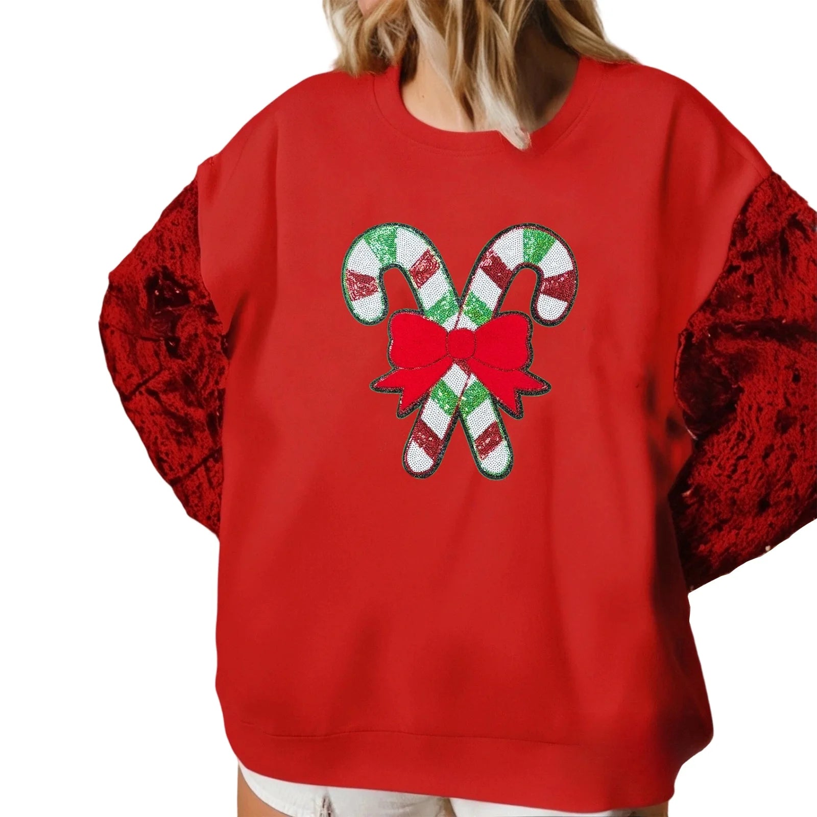 Spread holiday cheer in this festive crew sweater featuring shimmering sequins and playful candy cane embroidery. The relaxed, oversized fit keeps you cozy while the long sleeves provide warmth for chilly winter days. Perfect for holiday parties, casual gatherings, or lazy nights by the fire. This pullover style makes it effortless to slip on and go, while the eye-catching embellishments add just the right amount of sparkle to your festive wardrobe.