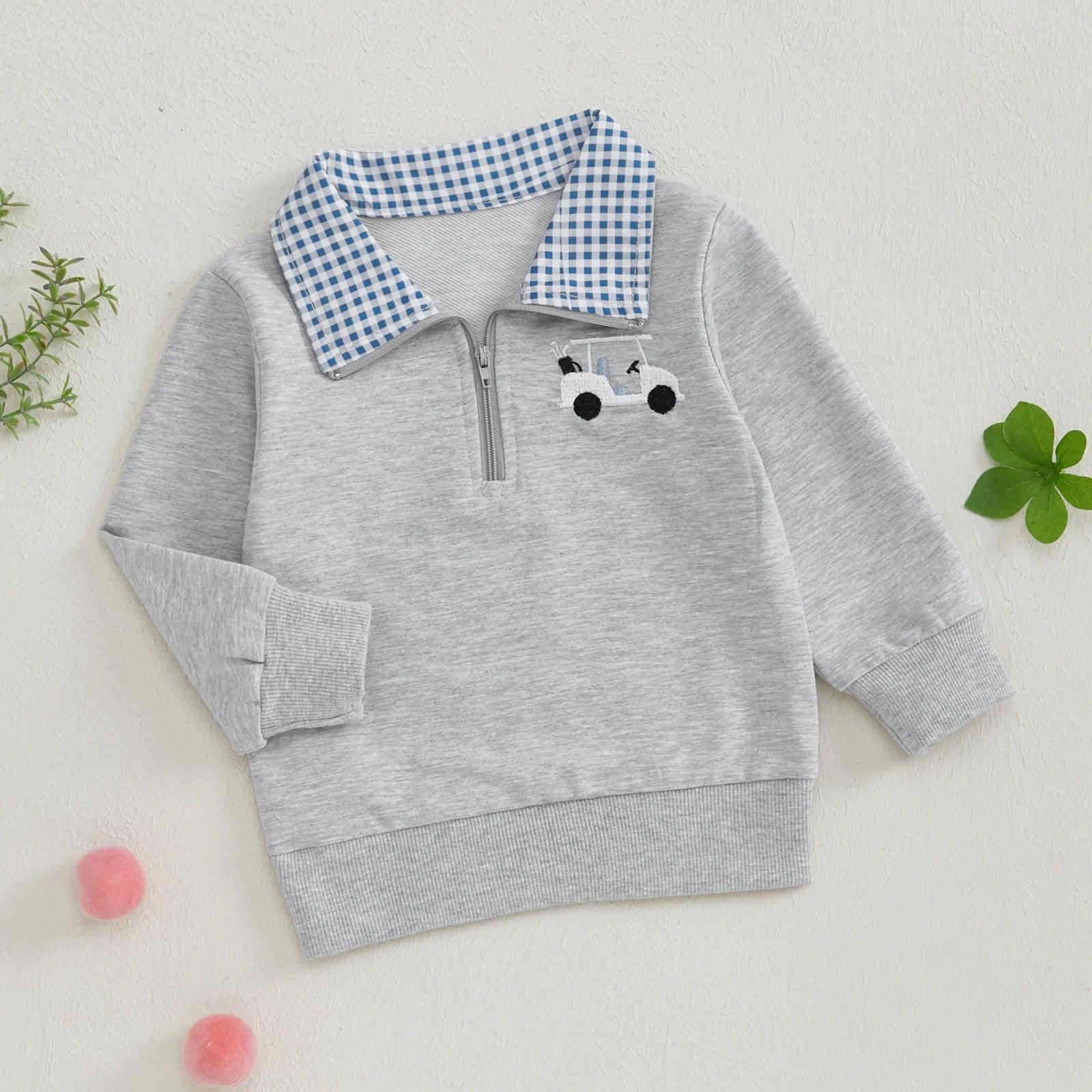 The Golf Kids Quarter Zip Sweatshirts is the perfect addition to your toddler's fall wardrobe. Featuring adorable truck and golf embroidery, this long-sleeve pullover is both stylish and cozy for cooler days. The soft fabric ensures comfort, while the practical design makes it easy to slip on and off. Ideal for autumn outings, playdates, or casual days, this sweatshirt offers a fun, trendy look that pairs well with jeans, leggings, or shorts. Keep your little one stylish and comfortable all season long with this charming sweatshirt.