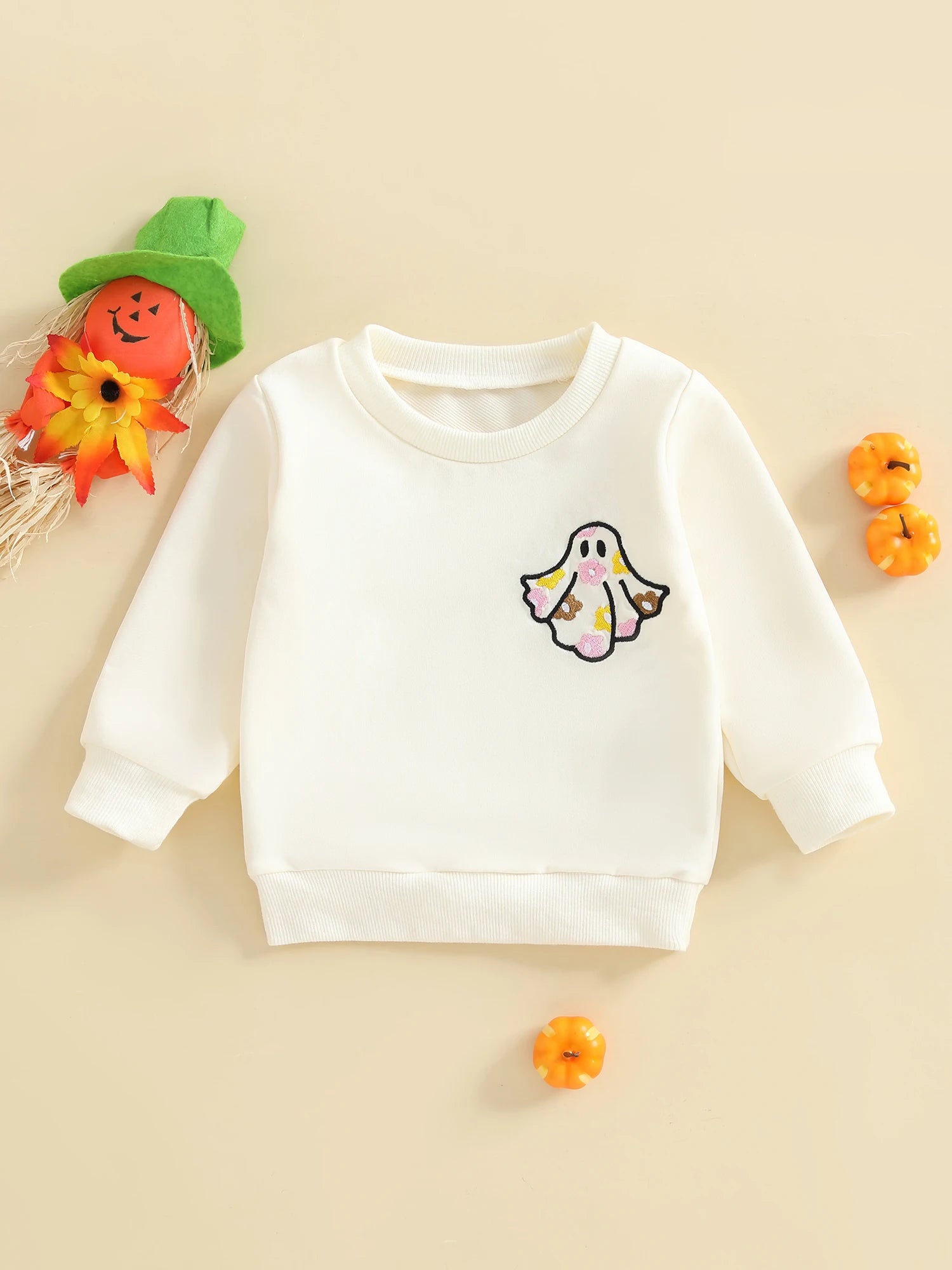 Boo-tiful style for little ones! This groovy ghost crew sweatshirt features adorable ghost embroidery on a cozy long-sleeve pullover perfect for Halloween fun or year-round wear. The soft round neckline and comfortable fit make it ideal for active kids who want to look spooky-chic. Whether trick-or-treating or just hanging out, this playful sweatshirt brings festive flair to any outfit.