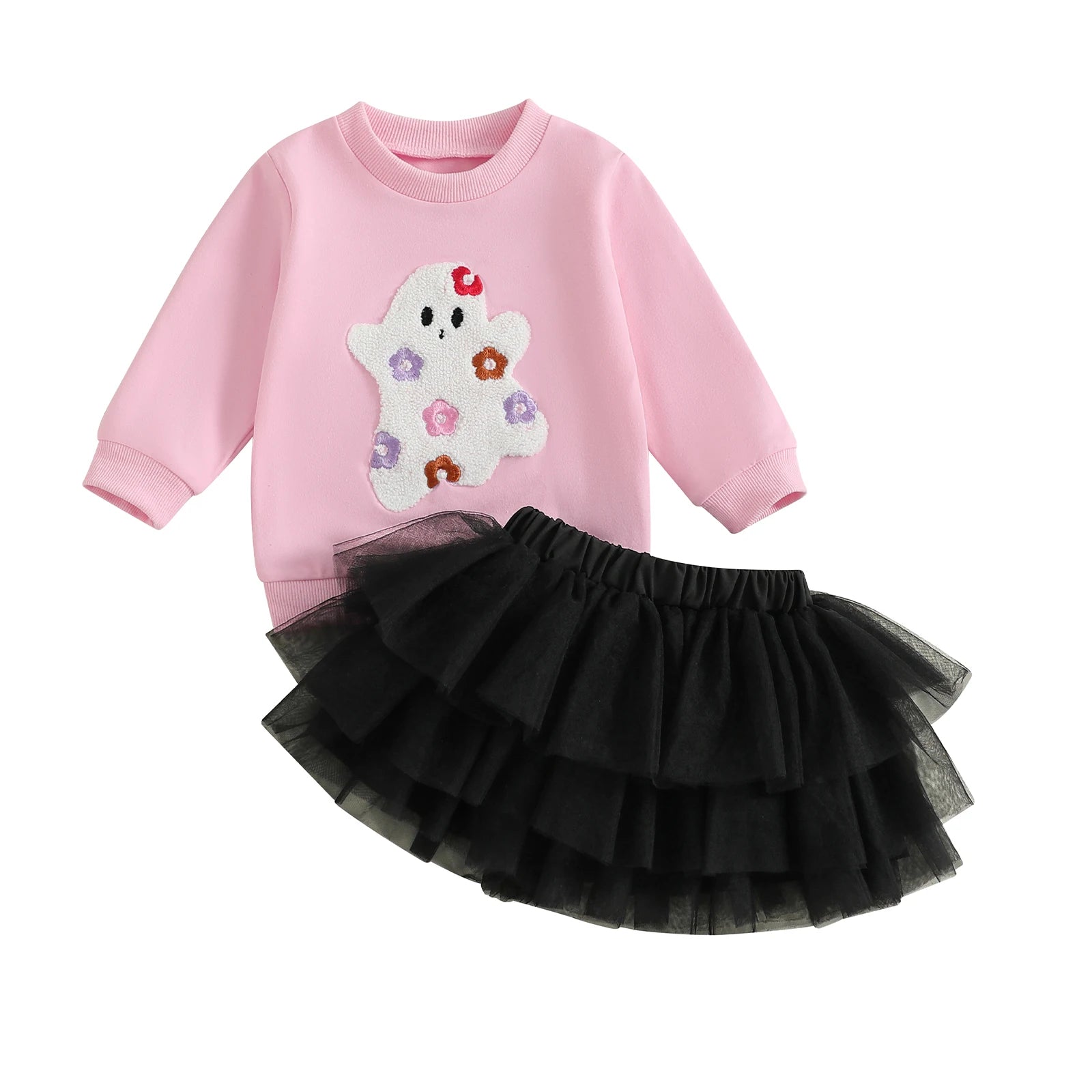 Get ready for spooky season with this delightfully creepy two-piece set! A cozy long-sleeve sweatshirt showcases an adorable ghost embroidery, paired with a twirly tulle skirt featuring an elastic waist for all-day comfort. Perfect for Halloween trick-or-treating, costume parties, or just embracing the festive spirit, this outfit lets your little girl celebrate in style. Soft, stretchy, and oh-so-cute, it's the costume she'll actually want to wear!