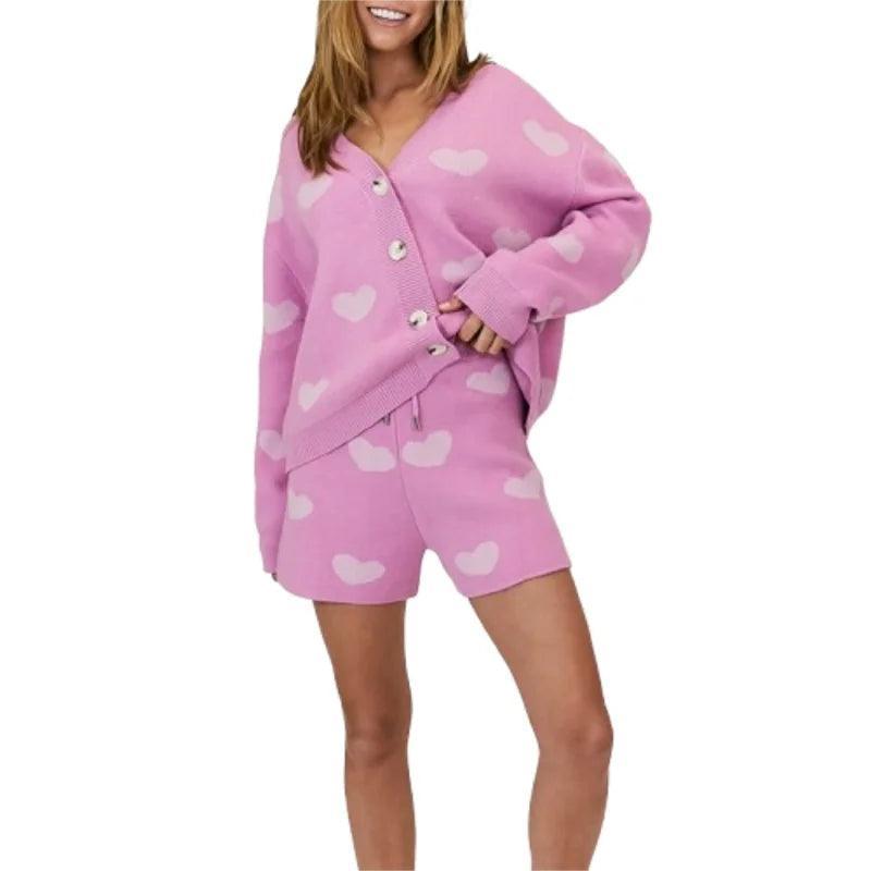 Celebrate love and style with the Heart Cardigan Loungewear Outfit, a Y2K-inspired Valentine's Day outfit that combines charm and comfort. This two-piece set features a cozy V-neck cardigan with adorable heart prints paired with matching knit shorts for a coordinated, effortlessly chic look. Whether you're enjoying a casual day out or lounging in style, this set is your go-to for a playful and trendy aesthetic.